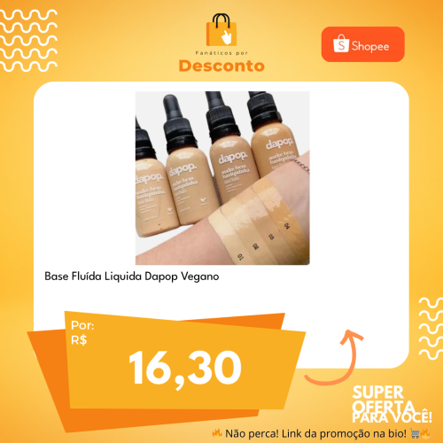 #BaseFluída #BaseLíquida #Dapop #Vegano #Makeup #PelePerfeita #CoberturaNatural #Hidratante #Radiante #Tonalidades #Confiança #Promoção #Desconto #Oferta #Beleza #Maquiagem #Cosméticos #FanaticosPorDescontos 🛍️🌟