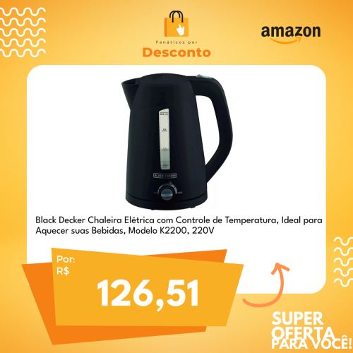 🔥 A Black Decker Chaleira Elétrica com Controle de Temperatura é tudo o que você precisa para aquecer suas bebidas favoritas de maneira rápida e prática! 🍵✨ Com o modelo K2200 de 220V, essa chaleira proporciona um controle preciso de temperatura para preparar seus chás, cafés, sopas instantâneas e muito mais com facilidade. 💨💫 Desfrute do conforto de poder ajustar a temperatura conforme sua preferência, garantindo sempre o ponto perfeito! Aproveite essa oferta imperdível e leve para casa um item que vai transformar seu dia a dia! ✨🛍️ #Promoção #BlackDeckerChaleiraElétrica #ControleTemperatura #EssencialParaCasa #220V